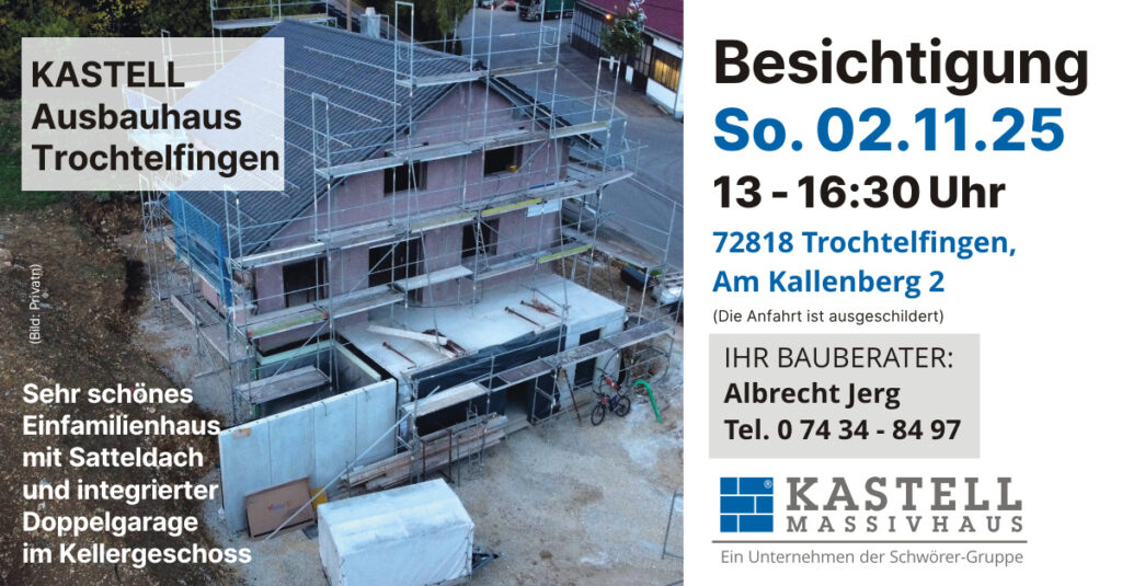 Du möchtest sehen, wie dein zukünftiges Eigenheim aussehen könnte? Dann nutze die Gelegenheit und besuche unsere Hausbesichtigung in Trochtelfingen. Am Sonntag, 2. November 2025 öffnet ein neu erstelltes KASTELL Massivhaus mit Satteldach und integrierter Doppelgarage im Kellergeschoss seine Türen für alle Hausbauinteressierten. Bevor die Bauherren mit dem Innenausbau beginnen, hast du die Möglichkeit, das Haus von innen zu erleben und dich von der hochwertigen Bauweise, den großzügigen Räumen und der durchdachten Architektur zu überzeugen.